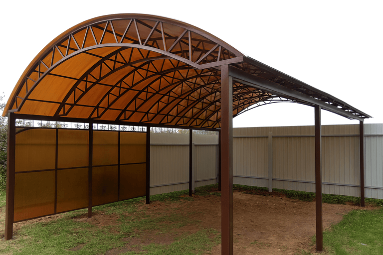 Клиент может заказать навес для автомобиля из поликарбоната в типовом исполнении или в виде индивидуального проекта. Все конструкции адаптируются под небольших или больших участков, а также сочетаются с архитектурой дома. Возможность купить навес для автомобиля из поликарбоната недорого зависит от выбранной формы, толщины покрытия и длины пролета.