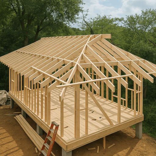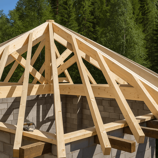 Устанавливаются диагональные, центральные и промежуточные стропила. От точности этого этапа зависит прочность всей конструкции. Мы используем качественный пиломатериал, а все соединения усиливаются металлическими элементами. -
